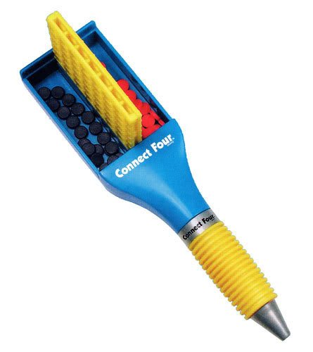 Makes a great gift The original vertical four-in-a-row checkers game and fully functioning ballpoint pen Mini game board and pieces Game board pivots up to play Players take turns positioning pieces The first player to get four in a row wins Read More..